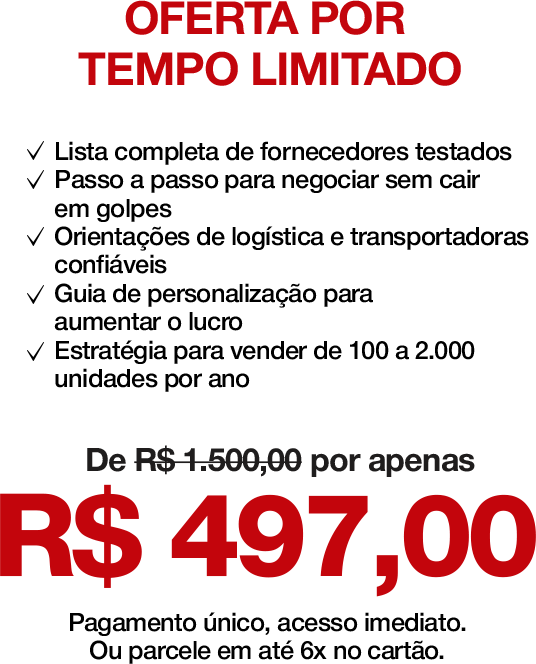 Eu tinha medo de levar golpe ou perder dinheiro, mas o guia deixa tudo tão claro que a insegurança foi embora. A lista de fornecedores vale ouro! Já estou no meu terceiro lote e começando a escalar.